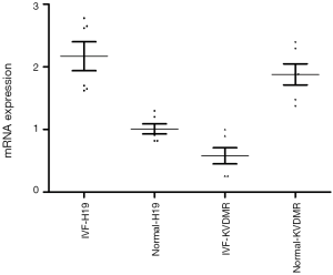 The mRNA expression levels of H19 and KvDMR1 in the IVF group compared with the natural pregnancy group