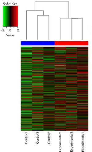 The expressed genes were analyzed by hierarchical clustering to display the gene expression differences comprehensively and intuitively between the two groups. Direct correlations were calculated based on the expression levels of selected genes.