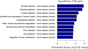 The top ten enrichment scores [–log10(P value)] for significant enrichment pathways associated with differentially methylated genes (Figure 4).