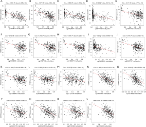 Using Survival R package, a survival analysis was performed to explore the correlation between the methylation and expression of key prognosis-associated genes in CESC. We extracted relevant methylated sites of key genes from the CESC methylation data. |Cor| >0.35 was used as cutoff criterion (16).