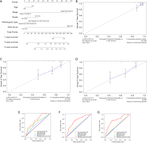 We created a nomogram to estimate the 1-, 3- and 5-year OS. The five independent prognostic factors included stage, age, histological type, grade and risk score (Figure 7A). The 45° line represented the best prediction. Calibration plots suggested that the nomogram performed well to predict the 1-year OS (Figure 7B,C,D). ROC curve analysis showed that the AUC value of the risk model was 0.730, much significantly higher than that of clinical stage (AUC =0.651), grade (AUC =0.621), age (AUC =0.573) and histological type (AUC =0.512). The nomogram was also efficient in predicting 3- and 5-year OS (Figure 7E,F,G).