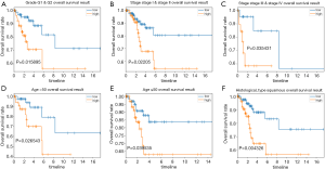 The stratification analysis was performed based on grade, age, stage and histological type. The patients were stratified into grade I/II subgroups, stage I/II and stage III/IV subgroups. As shown in Figure 8A, the prognosis of high-risk patients was significantly worse than that of low-risk patients in the grade I/II, stage I/II and stage III/IV subgroups (Figure 8B,C). We also assessed the prognostic ability of risk signature combined with age and histological type. The patients were also stratified into >50 years subgroup and ≤50 years subgroups. Interestingly, we found that high-risk patients in two subgroups were inclined to unfavorable OS (Figure 8D,E). The similar trend was also observed in the squamous cancer subgroup (Figure 8F).