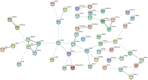 To evaluate the interrelationships among these methylation-driven genes, we uploaded them onto the Search Tool for the Retrieval of Interacting Genes (STRING) database (http://string-db.org/) to construct a PPI network (14).