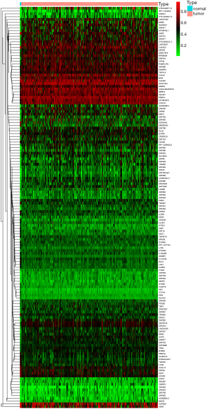 The gene expression data of 309 samples (306 CESC samples and 3 normal samples) and the methylation data of 312 samples (309 CESC samples and 3 normal samples) were downloaded from TCGA. The genes with abnormal expression were found out based on the LIMMA software package. The correlation between methylation level and expression level of each gene was investigated based on the MethylMix package. In the Wilcoxon rank test, the differential methylation was defined with |log Fold change (FC)| >0 and adjusted P<0.05, |Cor| >0.45. As a result, 144 CESC-related methylation-driven genes were screened out, and the heat maps of these aberrant methylation-driven genes were shown in Figure 1.