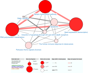 We performed GO and KEGG analyses by using DAVID and ConsensusPathDB online software, respectively. GO analysis revealed that in the aspect of BP, the genes were significantly enriched in “Transcription, DNA-templated and regulation of transcription, DNA-templated”. In the aspect of MF group, the genes were mainly involved in “Nucleic acid binding, Metal ion binding, Transcription factor activity, sequence-specific DNA binding, DNA binding and RNA polymerase II core promoter proximal region sequence-specific DNA binding”. In the aspect of CC, the genes were mainly enriched in “Nucleus” (Figure 2). KEGG pathway analysis showed that the genes were mainly enriched in “Generic transcription pathway, RNA polymerase II transcription, Gene expression (Transcription), The human immune response to tuberculosis, Apoptosis, Induction of apoptosis through dr3 and dr4/5 death receptors and TRAIL signaling” (Figure 3).