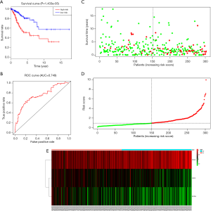 Through univariable and multivariate Cox regression analyses, we screened out prognosis-associated methylation-driven genes (Table S2). Then, we further performed a multivariate Cox proportional hazards regression analysis based on the top five most associative genes (ITGA5, SPRY4, HHEX, BIN2 and S1PR4). The results showed that the risk score calculated by three genes (ITGA5, HHEX and S1PR4) could be used as an independent indicator of CESC prognosis. The risk score = (0.334 × ITGA5) + (−0.326 × HHEX) + (−0.308 × S1PR1) (Figure S2). Moreover, according to their median values, a total of 302 CESC samples with corresponding clinical samples were divided into a high-risk group (151 samples) and a low-risk group (151 samples). And the results of Kaplan-Meier survival analysis showed that the overall survival rate in the low-risk group was significantly higher than that in the high-risk group (Figure 4A). The 5-year overall survival ROC curve showed the area under curve (AUC) was 0.749 (Figure 4B). It suggested that this model was reliable to evaluate 5-year overall survival of patients with CESC. Meanwhile, the risk scores, survival time, and expression levels indicated by the three genes for each patient were showed in Figure 4C,D,E. The expression levels of the three genes in low-risk and high-risk groups were shown in Figure S3A. The heatmap showed the expression of the three genes in high- and low-risk patients. We observed significant differences in histological type (P<0.01) and tumor status (P<0.001) between the high- and low-risk groups (Figure S3B).