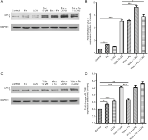 However, the addition of Lcn2 had no significant impact on LC3 II expression when platelets were treated with yersiniabactin (Figure 4C,D). We additionally treated platelets with iron to verify that activation of mitophagy in platelets after treated with siderophores was caused by iron deficiency. However, it was found the role of iron differed in different experiments. When platelets were treated with iron only, the expression of LC3 II increased compared with the control group. When platelets were treated with enterobactin plus iron, mitophagy was activated, and the expression of LC3 II was like that after the treatment of enterobactin only (Figure 4A,B). However, when platelets were treated with yersiniabactin plus iron, the expression of LC3 II decreased a lot compared with that after the treatment of yersiniabactin only (Figure 4C,D).