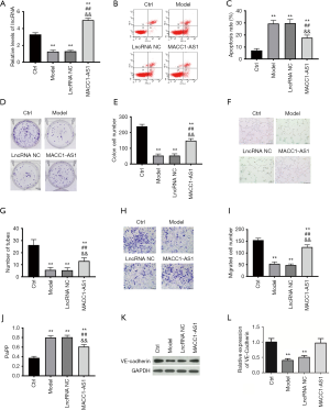 Angiogenesis is a vital compensatory mechanism, and tube formation assay was further performed to evaluate the effects of LncRNA MACC1-AS1 overexpression on angiogenesis under hypoxic conditions. A significant decrease was found in tube formation level in the model group when compared with the control group (Figure 1F,G). After LncRNA MACC1-AS1 overexpression, the tube formation capacity was enhanced under hypoxic conditions.