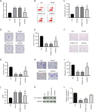 As stated above, the overexpression of lncRNA MACC1-AS1, which could downregulate miR-6867-5p, exerted protective effects under hypoxic conditions. To further investigate whether lncRNA MACC1-AS1 overexpression functions via sponging miR-6867-5p, the effects of miR-6867-5p downregulation were explored in hypoxia-induced vascular endothelial cells. Results showed that miR-6867-5p level was increased in the model group when compared with the control (Figure 3A), which is consistent with the results in Figure 2D. Furthermore, miR-6867-5p level reduced significantly following miR-6867-5p inhibitor treatment. Consistent with the above-mentioned results (Figure 1), increased cell apoptosis, declined clone formation capacity, decreased cell migration, reduced tube formation, increased permeability, declined VE-cadherin level, and elevated oxidative stress level were found in the model group when compared with the control (Figure 3A,B,C,D,E,F,G,H,I,J,K and Table 2). The cell proliferation, migration, and tube formation level under hypoxic conditions were all enhanced, while cell apoptosis and oxidative stress were reduced by miR-6867-5p inhibitor. The effects of miR-6867-5p downregulation are the same with the role of lncRNA MACC1-AS1 overexpression in hypoxia-induced vascular endothelial cells, strong support the notion that lncRNA MACC1-AS1 functions via sponging miR-6867-5p under hypoxic conditions.