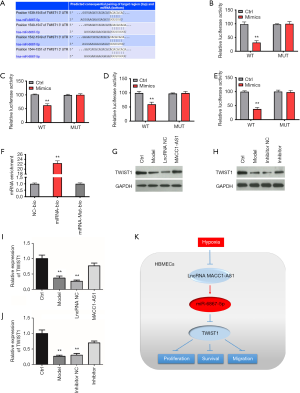 The downstream target of miR-6867-5p was also investigated. As seen from the results predicted by Targets can, TWIST1 was the target of miR-6867-5p (Figure 4A). Moreover, as presented by the luciferase reporter assay of the four binding sites, a significant decrease was found in luciferase activity of the WT-mimic group, while the luciferase activity remained unchanged in other group (Figure 4B,C,D,E), confirming that TWIST1 is targeted by miR-6867-5p. Moreover, it was observed in the RNA pull-down assay that the TWIST1 level was increased in the miRNA-bio group and unchanged in the other groups (Figure 4F), further indicating that TWIST1 is the direct target of miR-6867-5p. In order to further explore the relationship among lncRNA MACC1-AS1, miR-6867-5p, and TWIST1, we also conducted Western blot assay. We found that TWIST1 level was reduced significantly in the model group and markedly increased in the lncRNA MACC1-AS1 overexpression group and miR-6867-5p inhibitor group (Figure 4G,H). Since lncRNA MACC1-AS1 overexpression resulted in miR-6867-5p downregulation which could further upregulate the TWIST1 level, the results of Western blot assay were consistent with there being a regulatory relationship across the LncRNA MACC1-AS1–miR-6867-5p–TWIST1 axis. All the results provide evidence that LncRNA MACC1-AS1 functions via regulating miR-6867-5p and TWIST1 under hypoxic conditions.