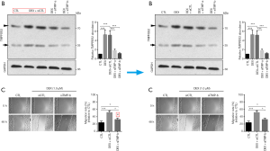 Corrected legend for Figure 2C: (C) Scratch assay was performed in DEX-treated MCF-7 that expressed siTMP-b. DEX-induced increase of migration was prevented by the siTMP-b. Magnification ×20 for all panels. Data are presented as mean ± SD. The experiment was carried out independently in triplicate. *, P<0.05; **, P<0.01; ***, P<0.001.