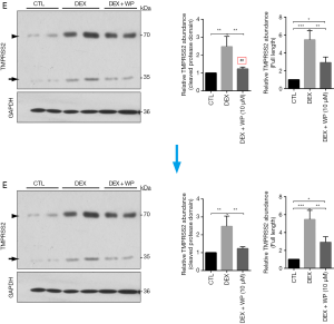 Corrected legend for Figure 3E: (E) MCF-7 was pretreated for 1 h with 10 µM of WP1066 followed by incubation for 48 h with 1 µM of DEX. Total cellular protein was extracted, and Western blot assay was performed to detect the expressions of full-length (arrowhead) and the cleaved protease domain (arrow) of TMPRSS2. Data are presented as the mean ± SD. The experiment was conducted independently in triplicate. *, P<0.05; **, P<0.01; ***, P<0.001.