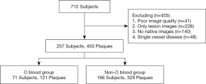The D’Agostino-Pearson test was used to determine the normality of the distribution of continuous variables. Continuous variables were expressed as mean ± SD. Categorical variables were expressed as percentages or numbers. Chi-squared and Student’s t-tests were used to compare continuous and categorical variables between blood type groups. Analysis of variance (ANOVA) and chi-squared tests were used to compare continuous and categorical variables among three blood groups (types A, B, and AB). The Bonferroni correction was applied for multiple hypothesis tests among the three groups. Non-normally distributed measurement data were described as medians. Comparisons between groups were made using the Kruskal-Wallis test. The important factors were included into the logistic regression analysis to determine factors associated with the incidence of TCFA. One-tailed P values <0.05 were considered to represent statistical significance. All data were analyzed using SPSS 20.0 software (International Business Machines Corporation, Armonk, New York, USA). The sample size was estimated using PASS software (NCSS Limited Liability Company, Kaysville, Utah, USA). The significance level was set at α=0.05 and the test efficiency power was 0.08. The sample size was calculated based on two independent samples t-tests and corrected with the pooled variance method. The minimum sample size (n=105, 35 cases in the control group and 70 cases in the experimental group) was obtained. In total, 71 patients with 121 plaques were included in the O blood type group and 186 patients with 329 plaques were included in the non-O blood type group, which comprised sufficient numbers according to our power calculation.