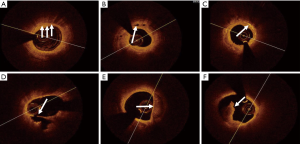 Plaques in OCT images were divided into fibrous and lipid plaques. Fibrous plaques were characterized by a uniform signal, high intensity, and weak attenuation. Lipid plaques displayed diffuse borders with low signals as well as strong attenuation regions. Lipid-rich plaques included those with a lipid arc (LA) of >90° and fibrous cap thickness (FCT) of <120 µm (20-22). The LA, lipid length (LL), and FCT of the lipid-rich plaques were measured. The LA was measured using a cross-section at each 1-mm interval, and the mean and maximum values were calculated; LL was measured using the longitudinal view; FCT was obtained using the average of three measurements at the thinnest section of the lipid-rich plaque. Thin-cap fibro atheromas (TCFAs), lipid-rich patches with a FCT of <65 µm, were identified from the OCT images (23). Macrophage infiltration was displayed as highly reflective region, with strongly attenuated point-like or banded structures, and often formed radial light and shadows after a high-signal point-like area (Figure 2A). Microchannels with diameters of 50 to 300 µm had signal-poor intensity (Figure 2B). Cholesterol crystals presented as thin and linear structures with high signal intensity and were usually located on the fibrous cap or necrotic core of plaques (Figure 2C). Plaque rupture in OCT was a continuous interruption of the fibrous cap accompanied by a ruptured cavity (Figure 2D). Calcification manifested as a high-signal area with sharp edges (Figure 2E). Thrombi appeared as irregular masses bonding with the facial part of the lumen or drifting in the lumen (Figure 2F) (24-27). The contents of macrophage infiltration, micro channels, plaque disruption, cholesterol crystals, and calcifications, as well as thrombi, were qualitatively analyzed. OCT image analysis was performed by two professional technicians using LightLab Imaging. When disagreements arose between the two analysts, the opinion of a third professional technician was sought to achieve a consensus.