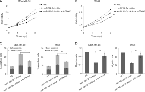After co-transfecting TNBC cells with miR-182-5p inhibitor and si-FBXW7, we found that the down-regulation of FBXW7 expression reversed the inhibition of miR-182-5p expression on cell proliferation and invasion, and reversed the promotion of miR-182-5p expression down-regulation on cell apoptosis (Figure 5A,B,C,D). The results suggested that miR-182-5p may play a regulatory role in tumor proliferation, apoptosis, and invasion by targeting FBXW7.