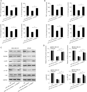 Increasing evidence showed that inflammation contributes to the occurrence of tumors. Inflammatory cells can promote tumor formation, release survival factors, promote angiogenesis and lymphangiogenesis, stimulate DNA damage, reshape the extracellular matrix to promote invasion, coat tumor cells to provide receptors that transmit cells through lymphatics and capillaries, and evade host defense mechanisms (5). Toll-like receptor 4 (TLR4), one of the essential receptors on the surface of immune cells, is often expressed in tumor cells and participates in the progression, invasion, and drug resistance of BC (6,7). TLR4 activates myeloid differentiation factor 88 (MyD88) after receiving tumor antigen information, promotes the nuclear transfer of nuclear factor-κB (NF-κB), and activates gene transcription, inducing the production of pro-inflammatory cytokines and causing inflammatory reactions (8,9). According to research reports, NF-κB pathway may be a key regulator in the progress of TNBC (10), which can participate in the growth, apoptosis, differentiation and inflammatory response of tumor cells by promoting the transcription of tumor regulatory factors, including cytokines, chemokines, cell adhesion molecules, and inducible pro-inflammatory enzymes, and ultimately affect the invasion and progress of tumor (11-14).