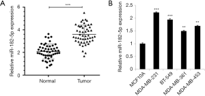 microRNAs (miRNAs), a type of small non-coding RNA composed of 18-24 single nucleotides, participates in the tumorigenesis process of various cancers, including BC (15). For instance, miR-185-5p inhibits invasion, migration, and epithelial-mesenchymal transition by regulating the specific receptor for advanced glycation end products in BC. MiR-19b can be used as a prognostic biomarker for BC and can promote cell proliferation, migration, and invasion by mediating phosphatidylinositol 3-kinase and serine-threonine kinase pathways (16). MiR-182, a miRNA with dual functions, is found on human chromosome 7q32.2 in the miR-183/96/182 cluster. It has been proved that miR-182 is up-regulated in TNBC, melanoma, endometrium, colon, and prostate and plays a tumor inhibitory role in lung cancer and gastric cancer (17-19). Also, studies have revealed that miR-182-5p promotes the invasion and proliferation of prostate cancer cells by mediating forkhead protein F2, reversal inducting cysteine-rich Kazakh motif protein, and transferring inhibitor 1 to promote the invasion and proliferation of prostate cancer cells (20). Inhibition of miR-182-5p can induce apoptosis and antiproliferation by regulating the expression of Caspase 9 in BC (18). Recent studies have shown that down-regulation of mir-182-5p can inhibit the proliferation and invasion of breast cancer by targeting the phosphatase tensin homologous gene (PTEN) deleted on chromosome 10 (21). However, the role and potential molecular mechanism of mir-182-5p in TNBC are still unclear.