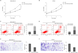 To further determine the role of miR-182-5p in TNBC, we evaluated the effect of miR-182-5p silencing on TNBC cell proliferation, apoptosis, and invasion through function loss experiment. According to the results in Figure 1B, MDA-MB-231 and BT-549 cells with the highest expression level of miR-182-5p were selected as the research objects of the follow-up experiment. CCK8 results manifested that downregulation of miR-182-5p expression significantly inhibited the cell proliferation ability of MDA-MB-231 (Figure 2A) and BT-549 cells (Figure 2B), and the inhibition became more evident with the prolongation of action time. Flow cytometry results evinced that downregulation of miR-182-5p expression significantly increased the apoptosis rate of MDA-MB-231 (Figure 2C) and BT-549 cells (Figure 2D). Transwell results verified that the downregulation of miR-182-5p expression significantly inhibited the invasion rate of MDA-MB-231 (Figure 2E) and BT-549 cells (Figure 2F). The above results suggested that miR-182-5p may contribute to TNBC cell proliferation and invasion and inhibit TNBC cell apoptosis.