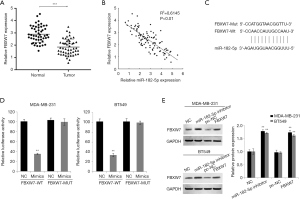 The target of miR-182-5p was predicted through microRNA.org and Targetscan online tools. FBXW7 scored the highest among all potential targets was found. We first detected the expression level of FBXW7 in TNBC tissue. QRT-PCR results identified that the expression level of FBXW7 in TNBC tissues was significantly lower than that in normal tissues (Figure 3A). Pearson correlation analysis suggested that the expression of miR-182-5p and FBXW7 in TNBC tissue was significantly negatively correlated (Figure 3B). Moreover, we constructed FBXW7 3'-UTR-WT and FBXW7 3'-UTR-MUT luciferase reporter plasmids (Figure 3C). After co-transfecting FBXW7 3'-UTR-WT or 3'-UTR-MUT and miR-182-5p mimics or NC into TNBC cells, we found that miR-182-5p mimic significantly reduced luciferase activity in the cells through double luciferin reporter gene experiments (Figure 3D). Further Western Blot tests indicated that downregulation of miR-182-5p expression in TNBC cells markedly increased FBXW expression (Figure 3E). The above results confirmed that miR-182-5p could target binding and negatively regulate FBXW7.