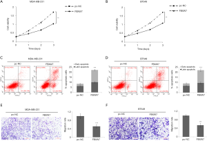 We further discussed the effects of FBXW7 on the proliferation, apoptosis, and invasion of TNBC cells. CCK8 results suggested that overexpression of FBXW7 significantly inhibited the cell proliferation of MDA-MB-231 (Figure 4A) and BT-549 cells (Figure 4B), and the inhibition became more evident with the prolongation of the action time. Flow cytometry indicated that overexpression of FBXW7 remarkably increased the apoptosis rate of MDA-MB-231 (Figure 4C) and BT-549 cells (Figure 4D). Transwell results confirmed that overexpression of FBXW7 notably inhibited the invasion rate of MDA-MB-231 (Figure 4E) and BT-549 (Figure 4F) cells. The above results suggested that FBXW7 may inhibit TNBC cell proliferation, invasion, and apoptosis.