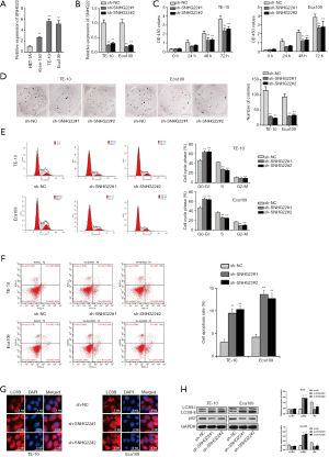 SNHG22 has been studied playing the oncogene role in ovarian epithelial carcinoma (16). In this study, we will search for the role of SNHG22 in ESCC. Firstly, the qRT-PCR assay was implemented for assessing the expression of SNHG22 in human esophageal epithelial cells and ESCC cells (Figure 1A). Then, we found that SNHG22 was highly expressed in ESCC cells (Kyse-150, TE-10, and Eca109), especially in TE-10 and Eca109. Thence, TE-10, and Eca109 cells were chosen for the following experiments. For detecting the biological behavior of TE-10 and Eca109 cells when SNHG22 was inhibited, we conducted a qRT-PCR assay to search the inhibition efficiency of SNHG22 (Figure 1B). Then, CCK8 and colony formation assay was implemented to evaluate the proliferation of TE-10 and Eca109 cells when SNHG22 was silenced (Figure 1C,D). We found that OD 450 values and numbers of colonies were both suppressed by SNHG22 inhibition, which indicated that knockdown of SNHG22 could reduce the cell growth of TE-10 and Eca109 cells. Also, flow cytometry analysis was conducted to test the cell cycle progress and apoptosis of TE-10 and Eca109 cells when SNHG22 was inhibited (Figure 1E,F). Results indicated that G0-G1 progress was increased. However, S and G2-M were decreased when SNHG22 inhibition was transfected in. and cell apoptosis rate of TE-10 and Eca109 cells increased much among silenced SNHG22. Thence, inhibited SNHG22 could suppress the cell cycle progress and elevate the apoptosis of TE-10 and Eca109 cells. It has been well proved that LC3B and P62 could act as autophagy markers in cells (20). Furthermore, IF assay and western blot assay were conducted to detect the autophagy of TE-10 and Eca109 cells (Figure 1G,H). LC3B expression and protein level were increased with inhibited SNHG22, and the P62 protein level was reduced. In conclusion, inhibited SNHG22 could suppress the proliferation and cell cycle progress of ESCC cells. Meanwhile, inhibited SNHG22 could increase the apoptosis and autophagy of ESCC cells.