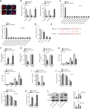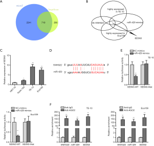 It has been proved that SNHG22 affects the chemoresistance of ovarian epithelial carcinoma by sponging miR-2467 (19). Thence, we searched the location of SNHG22 in TE-10 and Eca109 cells by FISH assay and subcellular fraction assay (Figure 2A,B). We found that SNHG22 was found in the cytoplasm of TE-10 and Eca109 cells. Thence we predict lncRNA can act as competing endogenous RNAs to regulate the expression of miRNA and mRNA, which forms as a pathway of lncRNA/miRNA/mRNA (21). Furthermore, we searched the ENCORI website and detected miRNAs that could bind to SNHG22.