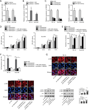 Furthermore, the western blot assay was conducted to verify the autophagy of TE-10 and Eca109 cells when miR-429 was overexpressed (Figure 2L). We found that LC3B-II levels were elevated, and P62 protein levels were decreased by overexpressed miR-429. In conclusion, miR-429 could bind to SNHG22 and act as a tumor suppresser in ESCC cells.