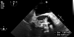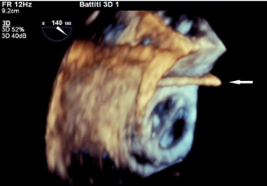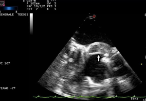 Both transthoracic echocardiography (TTE) and transoesophageal echocardiography (TEE) are the main imaging modalities for diagnosis of IE The European Society of Cardiology (ESC) classify echocardiography as 1B recommendation with echocardiographic results an important Duke criterion (2). Diagnosis based on echocardiographic images has high sensitivity and specificity to detect vegetations, a distinctive sign of IE, particularly if it measures >5 mm (Table 1) and for valve detachment (3). It is however less accurate when it comes to detecting abscesses, aneurysms, pseudoaneurysms, and fistulas. Echocardiography allows the rapid detection of vegetations (Figures 1,2), by measuring the major and minor axes of these, in addition to allowing differentiation from other intracardiac masses, informing the operator on location, mobility (fixed, mobile, oscillating) (Figure 3), echogenicity and potential complications such as the presence of leaks, fistulas, and dehiscences (2,4).
