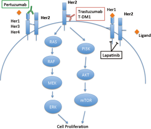 In the past 2 years, pertuzumab (Perjeta, Genentech) and ado-trastuzumab emtansine (T-DM1, Kadcyla, Genentech) have been FDA-approved for HER2-positive breast cancer. This article reviews the current evidence supporting pertuzumab and T-DM1 for HER2-positive breast cancer. Figure 1 summarizes the site of action of trastuzumab, lapatinib, pertuzumab and T-DM1 on HER2.
