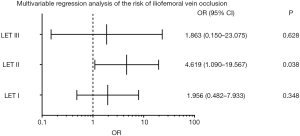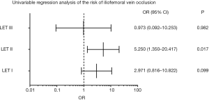 There were significant differences in the cumulative iliofemoral vein patency rates at 24 months and average Villatla scores at 6 months between these two groups (Table 4, Figure 2). However, there were no significant differences in the rate of oral anticoagulation drug intake, wearing ECSs, and the cumulative PTS rate at 6 months and 24 months or in the average Villatla score at 24 months (P>0.05) (Table 4, Figure 3). The univariable logistic regression and the multivariable logistic regression analyses indicated that the residual thrombus of LET II [odds ratio (OR), 4.619, 95% confidence interval (CI), 1.090–19.567, P=0.038] was an independent risk factor for raising iliofemoral vein occlusion by LET classification (Figures 4,5). Despite this, univariable logistic regression and the multivariable logistic regression analyses did not find any independent risk factor for the PTS when using residual thrombus by LET classification.