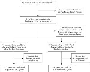 From March 2016 through June 2018, 94 consecutive patients confirmed with acute lower extremity DVT by ultrasound were admitted to our hospital. Three patients received anticoagulation therapy only, while the remaining 91 cases were treated by PCDT. After the treatment with PCDT, 17 cases without iliac vein compression syndrome (IVCS) and 1 case with bilateral DVT were excluded from the trial. The remaining 73 cases confirmed with IVCS were divided into two groups. Of these, 39 patients without residual popliteal and infrapopliteal vein thrombus were placed in the proximal DVT group, and the remaining 34 cases with residual popliteal vein thrombus or concomitant calf vein thrombosis were assigned to the extensive DVT group. Three patients died and nine were lost to follow-up in the proximal DVT group, while no patients died and eight were lost to follow-up in the extensive DVT group (Figure 1).