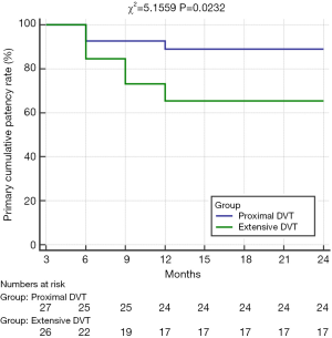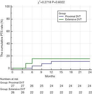 Patients’ clinical features and baseline demographics are provided in Table 1. Ten patients in the proximal DVT group versus three patients in the extensive DVT group had a history of major surgery, and the difference was significant (P=0.031). Meanwhile the there was no significance differences between these two groups in median age, median interval from the onset of symptoms, location of thrombosis, and concomitant comorbidities.