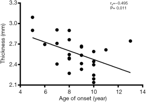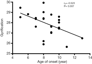 Correlation analysis revealed the negative correlation between age of onset and cortical thickness in the right precentral gyrus (rs=−0.495, P=0.011, Figure 5), age of onset and cortical gyrification in the left inferior parietal gyrus (rs=−0.523, P=0.007, Figure 6), VIQ and cortical gyrification in the left supramarginal gyrus of BECTS patients (rs=−0.455, P=0.022, Figure 7).