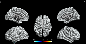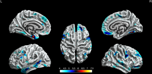 Also, we found increased cortical gyrification in the left hemisphere and partial right hemisphere and decreased cortical gyrification in the left hemisphere. Further, we found the BECTS patients’ neuropsychological scores were under or near normal, which was observed in some studies (6,10,12,23). As we all know, BECTS has language impairment and has indeed been recognized to belong to the epilepsy aphasia spectrum (24,25). We observed a negative correlation between VIQ and cortical gyrification in the left supramarginal gyrus of BECTS patients. Therefore, the reason we found the change of cortical gyrification mainly located in the left hemisphere that same as the study in Jiang et al. (23) is probably the laterality of cognitive functions or regions with language dominance.