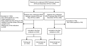 All patients who underwent ERCP from January 1, 2016, to May 16, 2019, were included. The exclusion criteria were the following: (I) non-native papilla (including post-sphincterotomy, post-papillectomy, post-papillary balloon dilatation, and post-choledochojejunostomy); (II) failed operation; (III) age <18 years; (IV) body weight <40 kg; (V) unable to provide informed consent; (VI) missing any of the indicators (Table S1). The exclusion criteria for the external test set (from May 17, 2019 to December 25, 2019) were the same as those of the training and internal test sets.