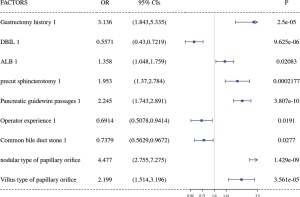 The present study identified gastrectomy history, high ALB, villous type of papillary orifice, nodular type of papillary orifice, pancreatic guidewire passages, and precut sphincterotomy as being risk factors for PEP, and high DBIL, common bile duct stone, and high operator experience as being protective factors. Because of the surgically altered anatomy, ERCP is more difficult in patients with previous gastrectomy compared with patients with the native anatomy. The papillary area in the second part of the duodenum can only be reached through the afferent loop. As a result, the papilla of Vater appears upside-down compared with its orientation during standard ERCP, making ECRP more difficult (18). High serum ALB levels might be an indicator of dehydration, and aggressive hydration has been reported as a means to prevent PEP. Previous studies suggest that aggressive hydration with lactated Ringer’s solution may alleviate activation of zymogen and inflammation response, and improve perfusion of pancreas parenchyma (19). Our study suggests that high serum ALB levels are a risk factor for PEP, but there is currently no relevant literature suggesting a relationship between ALB and PEP. Thus, further multicenter studies are needed for confirmation, and basic research is required to clarify its underlying mechanism. The type of papillary orifice of Vater will influence the difficulty of cannulation (20,21). A precut sphincterotomy is usually applied after difficult cannulation, which will increase the success rate of ERCP but will increase the risk of PEP (22). Previous studies have found that the guidewire entering the pancreatic duct may be a risk factor for PEP (23,24), and our research also confirms this. A pancreatic duct guidewire entering too deep may cause a certain degree of damage to the pancreatic duct, thereby promoting the occurrence of PEP (25-27). On the other hand, high DBIL, common bile duct stone, and high operator experience were identified as protective factors for PEP. The experience of the operator is a well-recognized factor in avoiding iatrogenic injury during ERCP and the occurrence of PEP (3,8) Furthermore, one study revealed that patients with obstructive indications of ERCP, such as common bile duct stone and high DBIL levels, tolerated ERCP better than those without such indications (28).