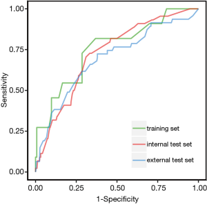 The model in the training set had an AUC of 0.793, a sensitivity of 0.727, and a specificity of 0.797; the model in the internal test set had an AUC of 0.725, a sensitivity of 0.705, and a specificity of 0.700; the model in the external test set had an AUC of 0.718, a sensitivity of 0.723, and a specificity of 0.676 (Figure 3).