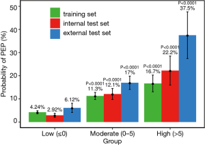 Figure 4 presents the probability of PEP. The probability of PEP correlated with the degree of risk in the groups. In the training set, among patients at low, moderate, and high risk of PEP, the actual occurrence of PEP was 4.2%, 11.3%, and 16.7%, respectively. In the internal test set, among patients at low, moderate, and high risk of PEP, the actual occurrence of PEP was 2.9%, 12.1%, and 22.2%, respectively; in the external test set, those frequencies were 6.1%, 17.0%, and 37.5%, respectively.