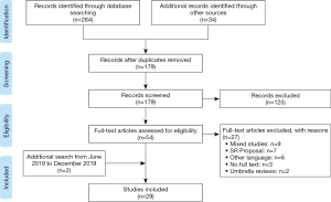 A total of 318 articles were identified. After removing duplicates and screening the titles and abstracts, we finally included 29 systematic reviews (Figure 1).