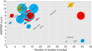 The X-axis shows the number of studies included in each systematic review or meta-analysis, and the Y-axis the AMSTAR score.