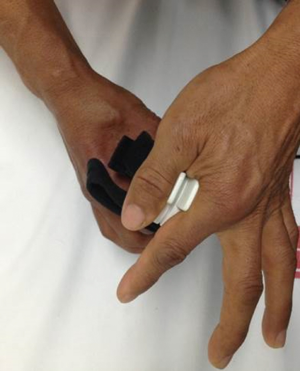 Six months after surgery, we used the hand function instrument (Pablo System, Tyromotion, Graz Austria) to estimate the pinch strength between the thumb and index finger in both hands of each patient in the CuTS group (Figure 1). To estimate strength, we instructed the patients to put their thumb and index finger on either side of the pressure sensor. The patients were then ordered to press the sensor and the strength data were recorded by the software. The pinch strength ratio was calculated by dividing the surgical-side pinch strength by the strength of the normal side. If the patient missed follow-up, we would not calculate pinch strength ratio of the patient.