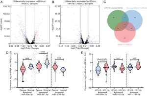 Overall, we determined that miR-99a-3p, miR-411-5p and miR-4746-5p are expressed differently in HPV16+ HNSCC patients. HPV16+ patients showed less PNI and more favorable OS with miR-99a-3phighmiR-411-5plowmiR-4746-5phigh expression. Further functional analysis showed downregulation of EMT gene sets and invasion related genes in HNSCC patients with miR-99a-3phighmiR-411-5plowmiR-4746-5phigh expression. The above results indicated possible roles of miR-99a-3p, miR-411-5p and miR-4746-5p in HPV16+ HNSCC progression. Furthermore, more comprehensive studies are required to affirm the MFs of the 3 miRNAs in HPV+ HNSCC.