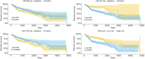 The expression levels of selected DEMs underwent log2 transformation before analysis. Each patient was classified as having either positive or negative expression according to the corresponding median miRNA expression. The Kaplan-Meier approach with log-rank analysis using the R package (survival) was adopted to determine the role of candidate prognostic miRNAs in HNSCC. In addition, overall survival (OS) analysis for HNSCC patients with high or low risk, based on the calculated risk score was also performed to estimate the prognostic value of all selected DEMs.