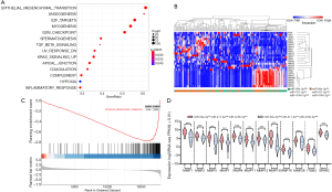 To determine the possible effects of miR-99a-3p, miR411-5p and miR-4746-5p in HPV16+ HNSCC patients, we screened the DEGs in HNSCC samples with miR-99a-3phigh miR-411-5plow miR-4746-5phigh expression prior to undertaking GSEA analysis. Analysis of hallmark gene sets displayed significant changes of gene expression related to EMT, angiogenesis, E2F-targets and myogenesis in HNSCC patients with miR-99a-3phigh miR-411-5plow miR-4746-5phigh expression (Figure 4A). EMT gene sets were significantly downregulated in HNSCC patients with miR-99a-3phigh miR-411-5plow miR-4746-5phigh expression (Figure 4B).