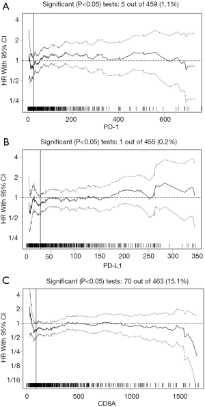 The median mRNA expression values for CD8A, PD-1, and PD-L1 were 245.23, 60.48, and 55.27, respectively. The biostatistical tool Cutoff Finder was used to identify a range of cutoff values for CD8A, PD-1, and PD-L1. The optimal cutoff values for assessing OS were 95.52 for CD8A, 27.4 for PD-1, and 29.41 for PD-L1 (Figure 1A,B,C). The cutoff value for each gene was used to divide cases into high and low expression groups according to whether the gene expression level was higher or lower than the cutoff point. The distribution of cases for each gene in the high and low expression groups is shown in Table 1.