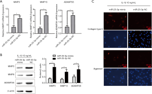 NP cells transfected with a miRNA-25-3p mimic inhibited IL-1β-induced effects on associated ECM-degrading enzymes (MMP3, MMP13 and ADAMTS5). The mRNA and protein expression of ECM-degrading enzymes decreased in the miRNA-25-3p mimic group (Figure 5A,B). Subsequently, the expression of the ECM proteins collagen type II and aggrecan recovered (Figure 5C). This suggests that miRNA-25-3p has a protective effect on NP cells while inhibiting the IL-1β signaling pathway.