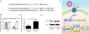 According to the target gene prediction by the miRBase database, MTF1 might be a target protein of miRNA-25-3p. To identify the target of miRNA-25-3p, a dual luciferase assay was implemented. A putative miRNA-25-3p seed sequence was expected in the 3'UTR region of MTF1 (Figure 6A). As shown in Figure 6B, luciferase activity was significantly decreased in NP cells with miRNA-25-3p transfection compared to those treated with the NC, however, mutation of the predicted seed sequence of miRNA-25-3p on MTF1 3'UTR salvaged this effect. To further verify the effects of miRNA-25-3p on MTF1 expression, NP cells were transfected with a miRNA-25-3p mimic and the NC. Compared with the miRNA-25-3p NC, NP cells transfected with the miRNA-25-3p mimic exhibited a decreased expression of MTF1 mRNA (Figure 6C) and protein (Figure 6D). These results demonstrated that miRNA-25-3p precisely regulated the expression of MTF1, thus has a protective effect on NP cells stimulated with IL-1β. Overall, IL-1β promoted zinc transporter ZIP8 expression and enhanced MTF1 nuclear translocation. This led to an increased expression of MMP3, MMP13, and ADAMTS5 matrix degrading enzymes and ECM degradation. Therefore, miRNA-25-3p has the potential to silence MTF1 protein expression and have protective effects on IDD (Figure 6E).