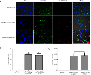 NP cells were seeded on a 24-well plate at a density of 2×104 cells/well and incubated overnight. At the time of transfection, the medium in each well was replaced with 400 µL of DMEM medium. Cy3-miRNA-25-3p/MCBC (5 nmol Cy3- miRNA-25-3p in 20 µL solution) at an N/P ratio of 8 were added into each well. This group was named Cy3-miRNA-25-3p/MCBC. For comparison, pure Cy3-miRNA-25-3p and Cy3-miRNA-25-3p/Lipofectamine 2000 were also added into the 24-well plate, separately under the same condition. After a 6-hour incubation, the medium was replaced with fresh normal medium, followed by incubation for an additional 24 hours. Cultured cells were washed 3 times with PBS. DAPI (150 ng/mL in PBS) and LysoTracker Green (50 nmol/L) were used to stain nuclei, and later, endo-lysosomes of cultured cells. Cellular uptake was imaged by a fluorescence microscope (Zeiss Axioplan microscope, Carl Zeiss Microscopy, Thornwood, NY, USA).