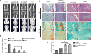 The health status of the animals was good throughout the study. No adverse events were found in all procedures. All rats in each group (n=6) were included in the subsequent analyses. The degree of IDD was evaluated by radiographic and histological analysis. As shown in Figure 8A, the normal control intervertebral discs maintained good intervertebral space height, and the intervertebral disc periphery remained flat and smooth. However, IDD in the sham and NC treatment group was obvious. The height of the intervertebral space decreased significantly and the structure of the intervertebral disc periphery was damaged. The height of the intervertebral space in the miRNA-25-3p mimic treatment group was significantly better than that in the sham and NC treatment groups, however, the height of the intervertebral space was decreased when compared with that of the control group. Further statistical analysis of disc height index results showed that miRNA-25-3p mimic treatment could better maintain intervertebral height, suggesting mild degeneration (P<0.05) (Figure 8B).