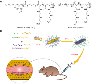 Increasing evidence demonstrates that miRNA-based gene therapy has significant therapeutic potential in various human diseases (18,19). However, miRNAs and their negatively charged mimics cannot cross the cell membrane easily. In addition, ‘naked’ miRNAs are highly susceptible to degradation in serum (20). Therefore, miRNA-based treatment must rely on vector-mediated delivery. For miRNAs to translate into effective and successful therapeutic agents, suitable carriers must be non-immunogenic, in a stable physiological condition, and avoid rapid clearance in vivo. Based on our previous work, a novel thermo-responsive vector was formed by mixed cationic block copolymers (MCBC): Poly(ethyleneglycol) (PEG) -b- poly [PAsp(DET)] and poly(Nisopropylacrylamide)-block-PAsp(DET) [PNIPAM-b-PAsp(DET)] (Figure 1A). It was demonstrated to be an effective and safe gene vector for gene therapy of IDD by percutaneous injection in a rat model. Heme oxygenase-1 (HO-1) pDNA carried by a thermo-responsive vector has shown high transfection efficiency and stability both in vivo and vitro (21,22). However, the ability of the novel thermo-responsive vector to deliver miRNA-25-3p effectively has not been tested. To further verify the effects of miRNA-25-3p in vivo and to translate this emerging therapy to humans in the future, studies involving preclinical animal models are an essential step. Rat models for disc degeneration induced by puncture have been widely used (23). It provides an effective model with easy to implement interventions, minimal risk of damage, and high reproducibility.